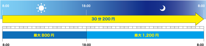 8:00~18:00 10時間以内 最大 800円(繰り返し) 18:00~8:00 14時間以内 最大 1,200円(繰り返し) (最大料金は繰り返し適用です) |