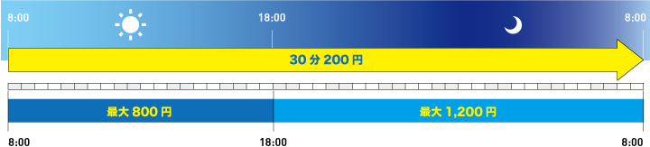 8:00~18:00 10時間以内 最大 800円 18:00~8:00 14時間以内 最大 1,200円 (最大料金は繰り返し適用です) |